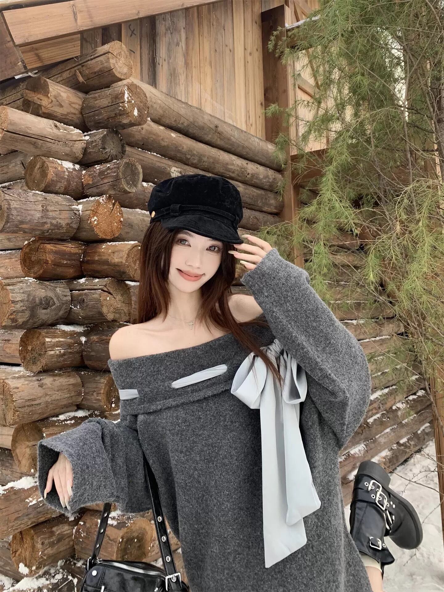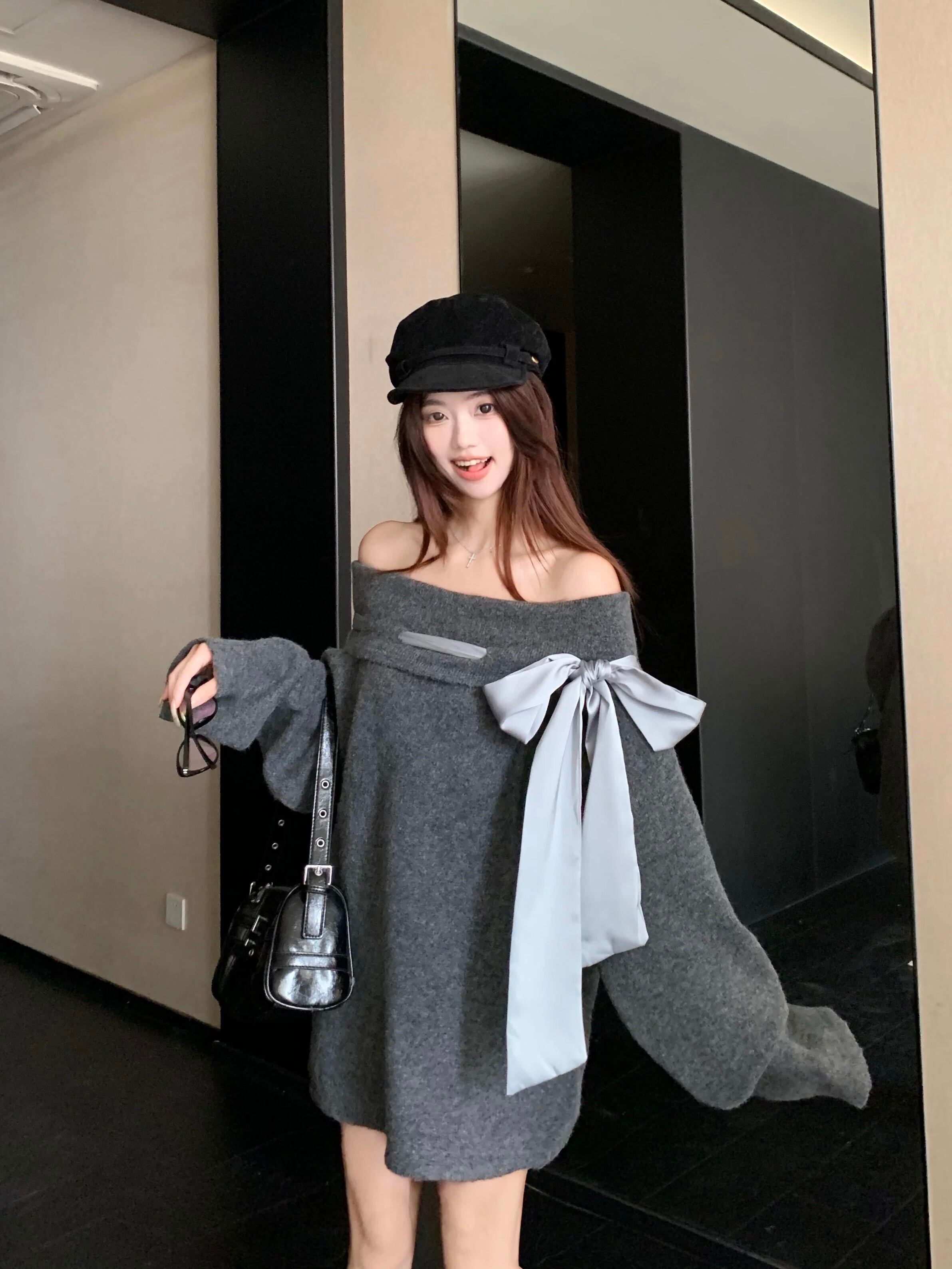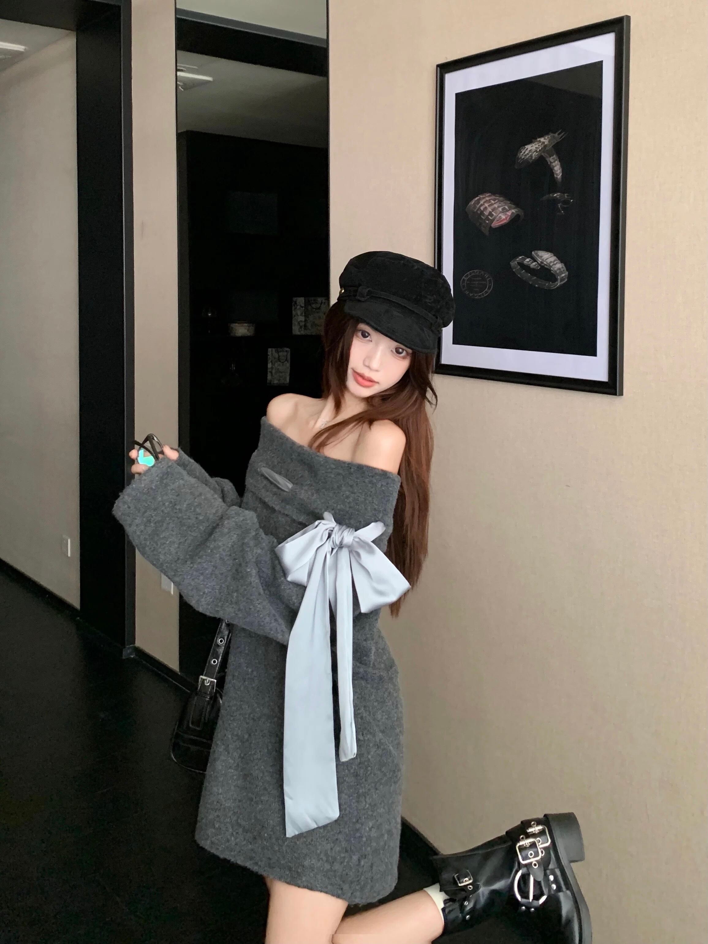 romierose 2025新作 オフショルビックリボンニット あざとい コア系 ブロークコア 純欲 セクシー 秋冬 オシャレ モテ服 デート服 女子力 y2kファッション ワンホン服 rr25101501