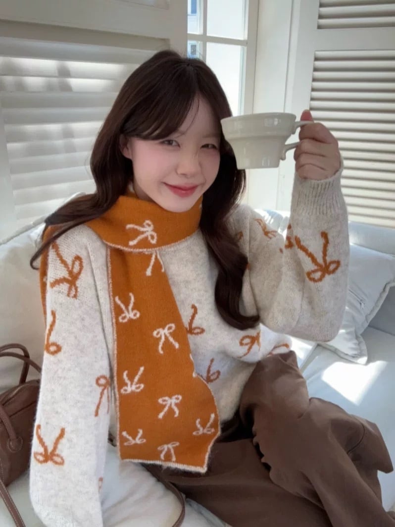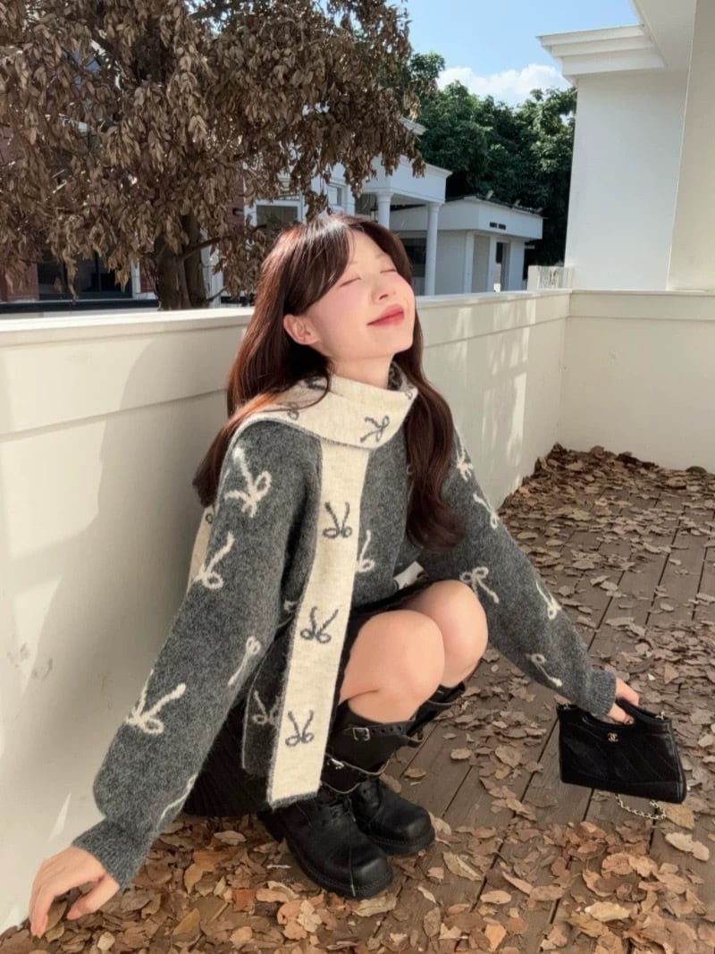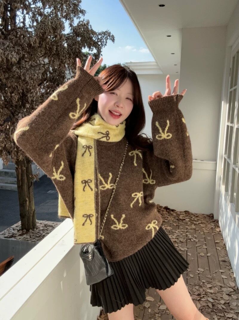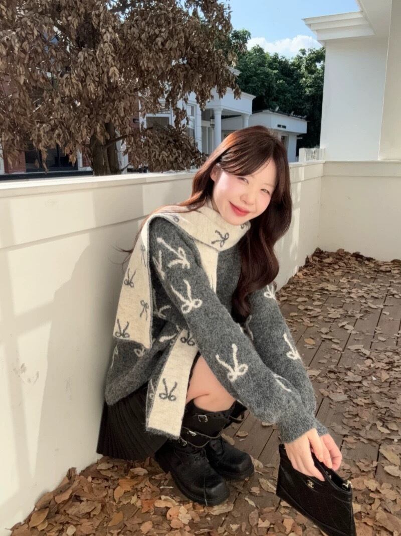 romierose 2025新作 マフラー付きリボンニット あざとい コア系 ブロークコア 純欲 セクシー 秋冬 オシャレ モテ服 デート服 女子力 y2kファッション ワンホン服 rr25112301