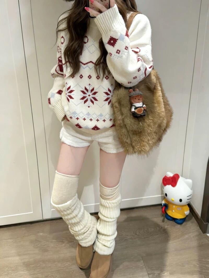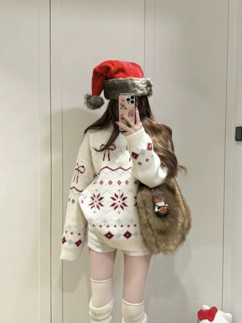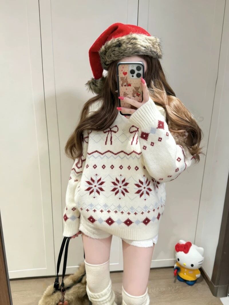 romierose 2025新作 リボン雪の結晶モチーフニット あざとい コア系 ブロークコア 純欲 セクシー 秋冬 オシャレ モテ服 デート服 女子力 y2kファッション ワンホン服 rr25122401